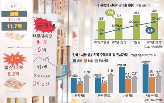 비수기에도 전셋값 상승세가 이어지자 가을 이사철에 수도권발 전세대란 재현 가능성을 우려하는 목소리가 높다. 2년마다 목돈을 준비해야 하는 서민 세입자들의 대출 액수가 급증, 서민 전세 세입자들이 이미 가계부채의 새로운 위험군으로 부상한 상황이다.
