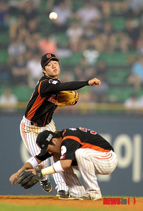 【서울=뉴시스】고범준 기자 = 9일 오후 서울 잠실야구장에서 열린 2013 한국야쿠르트 세븐 프로야구 LG 트윈스와 롯데 자이언츠의 경기에서 5회말 2사 2루 롯데 신본기가 LG 손주인의 타구를 잡아 1루에 송구하고 있다. 2013.08.09.