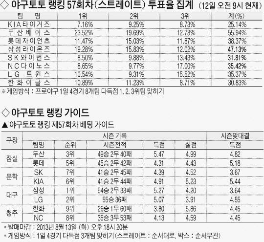 국민체육진흥공단(www.kspo.or.kr)이 발행하는 체육진흥투표권 수탁사업자 스포츠토토 공식발매사이트인 베트맨(www.betman.co.kr)은 13일에 개최되는 두산-롯데, SK-KIA, 삼성-LG, 한화-NC 등 4경기 8개팀을 대상으로 한 야구토토 랭킹 57회차 스트레이트 게임 중간집계 결과 두산(55.94%), 삼성(47.13%), 롯데(38.37%)를 차례로 다득점 상위 3개팀으로 꼽았다고 밝혔다. 반면 한화(30.83), KIA(25.14%)는 가장 적은 득점을 기록할 것으로 예상했다.