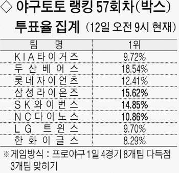 한편 순위에 상관없이 다득점 3개팀만을 맞히는 '박스' 게임에서는 두산(18.54%), 삼성(15.62%), SK(14.85%)가 가장 많은 득점을 기록할 것으로 집계됐다. 최소득점에서는 LG(9.70%), 한화(8.29%)가 가장 적은 득점력을 보일 것으로 전망됐다.