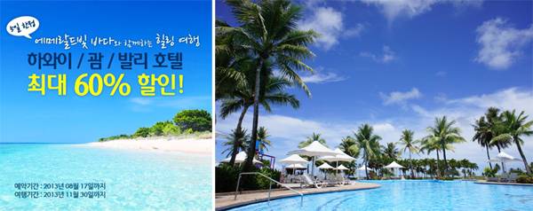 과도한 업무와 단조로운 일상 속에서 스트레스로 지쳐있다면 가슴 속까지 시원해지는 에메랄드 빛 바다로 힐링여행을 떠나자! 세계 최대 온라인 여행사 익스피디아(www.expedia.co.kr)는 8월 13일부터 17일까지 5일간 세계 3대 휴양지 하와이, 괌, 발리의 유명 호텔들을 최대 60% 할인하는 프로모션을 진행한다.