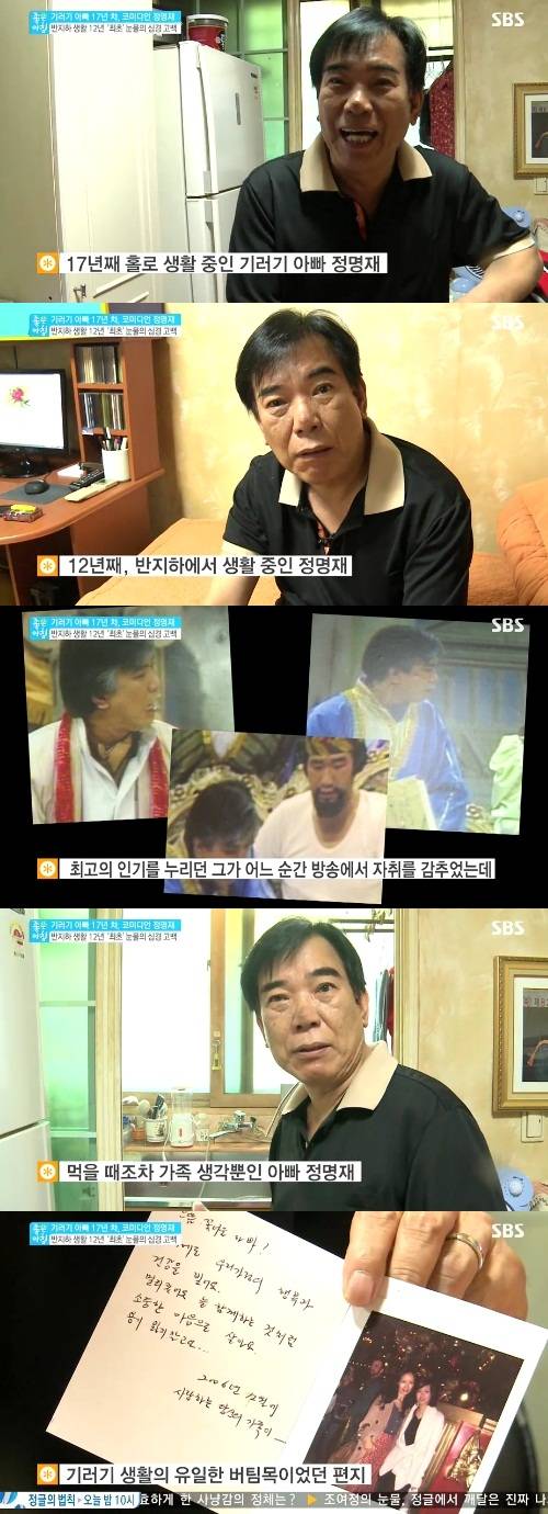 정명재는 16일 방송된 SBS '좋은아침'에서 "12년째 반지하에서 생활하고 있다. 아침에 눈 떴을 때 해가 보고 싶었다"고 말해 안타까움을 자아냈다. 그는 이날 혼자 음식을 준비하는 과정에서 "아내 손맛이 그리울 때 있다"고 말했다.