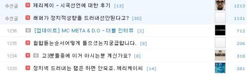 | ▲ 제리케이 '시국선언'에 대한 힙합 커뮤니티 반응 힙합 커뮤니티 힙합플레이야 게시판에 제리케이 시국선언 관련 게시물이 높은 조회수를 보이며 추천글로 올라 있다. |