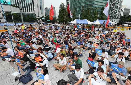 (서울=연합뉴스) 한종찬 기자 = 18일 오후 서울 종로구 보신각 앞에서 열린 '고용허가제 폐지! 노동 3권 쟁취; 2013 이주노동자 투쟁의 날 집회'에서 참가자들이 구호를 외치고 있다. 경기이주공대위, 민주노총 외국인이주ㆍ노동협의회 주최로 열린 이 집회에는 200여 명이 참가했다. 2013.8.18