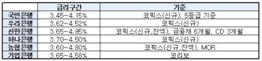 은행별로는 국민은행은 연 3.45~4.15%(5등급 기준, 신규 코픽스 기준), 우리은행은 3.62~4.52%(신규 코픽스 기준)의 금리를 정했다. 신한은행은 3.65~4.95%(신규·잔액 코픽스, 금융채 6개월, CD 3개월), 하나은행은 3.70~4.50%(신규 코픽스 기준)이다. 또 기업은행은 3.65~4.58%(코리보), 농협은행은 3.60~4.80%(신규·잔액 코픽스, MOR)다.