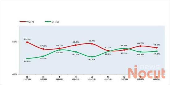 지난해 대선은 이전 대선과 달리 막판까지 대접전 양상을 보였다. 대선결과를 자신 있게 예측한 사람은 많지 않았다. 그런데 대선 사흘전 발표된 국정원 선거 개입 의혹 사건에 대한 경찰의 이른바 '중간수사결과' 발표는 그 같은 대선 판도를 뒤흔들었다. 여론조사기관인 리얼미터 이택수 대표는 "당시 공표되지 않은 리얼미터와 방송 3사의 여론 조사결과를 보면, 문재인후보가 박근혜 후보를 앞서기 시작했다가 경찰의 '중간수사결과' 발표 이후 다시 꺾이는 이른바 골든크로스가 공통적으로 나타났다"며 "여론조사 결과만 놓고 보면 경찰 발표가 여론에 상당한 영향을 미쳤다고 볼 수 있다"고 말했다. 당시 여론의 추이를 살펴보자.(사진=리얼미터 제공)