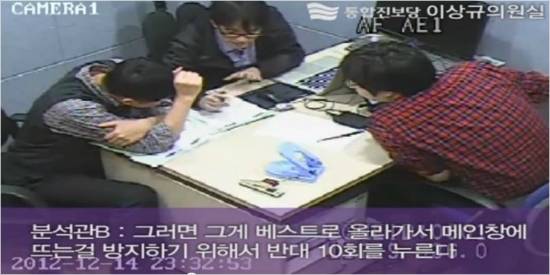 2012. 12. 15. 04:02\n(분석관1) 주임님 닉네임이 나왔네요\n(분석관 2명) 박수 짝짝짝\n\n2012. 12. 15. 04:09\n(분석관1) 이거는 수사팀에다 구두로 넘겨주자, 있는거가 중요하니까. 팩트만 넘기고.. 판단은 거기서 하게 합시다. 우리가 판단하지 맙시다. \n(분석관2) 일단은 내일 요거 뽑아서 넘깁시다\n(분석관1) 어렵게 가지 말고 쉽게 가자구요\n(분석관3) 한건했잖아 너 땜에..\n(분석관1) 그거 니꺼 찾아와서 로그인 찾아와서 국내사이트만.. 표시를 해봐\n(분석관2) 똥글뱅이를 칩시다, 다음에 계정은 무얼 찾겠다 관련글은 무얼 찾겠다.