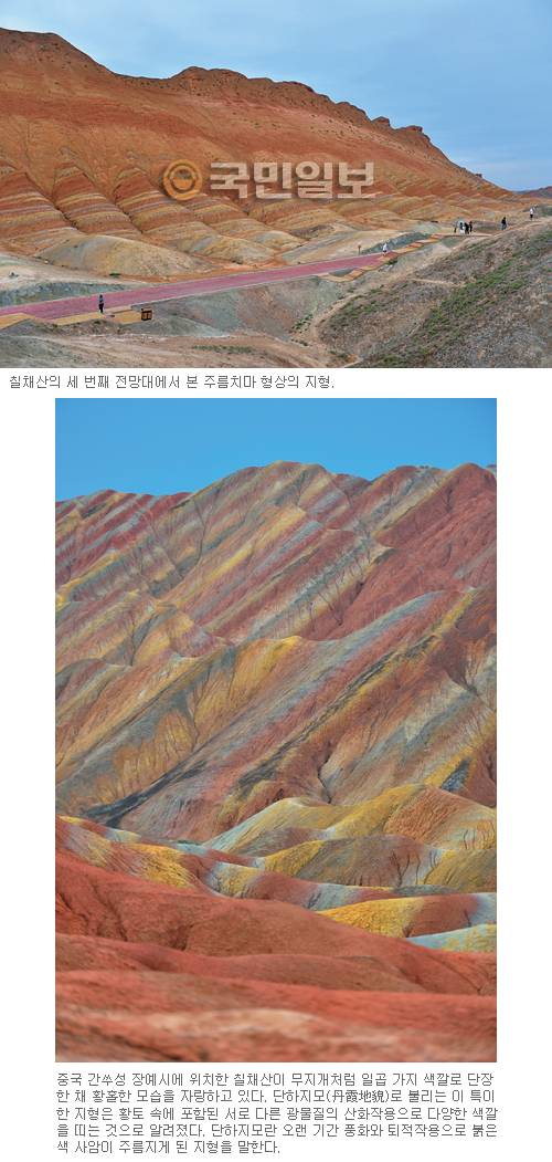 무지개가 땅으로 내려온 듯 황토산에 색색의 물감을 채색한 듯 인간의 상상력을 초월하는 비현실적인 풍경이 있다. '대지의 색채예술'로 불리는 중국 간쑤성(甘肅省) 장예(張掖·장액)시의 칠채산(七彩山)이 바로 그 주인공이다. 일곱 가지 색채를 띠는 칠채산의 공식 이름은 장액단하국가지질공원으로 단하(丹霞)는 '붉은 노을'을 뜻한다.