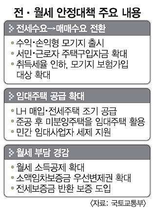 [서울신문]28일 발표된 전·월세시장 안정대책은 전세 수요의 매매 수요 전환, 임대주택 공급 확대, 월세 세입자 지원 확대로 요약된다. 공급 확대 정책 일변도에서 수요자 중심의 금융·세제 지원을 담은 게 특징이다.