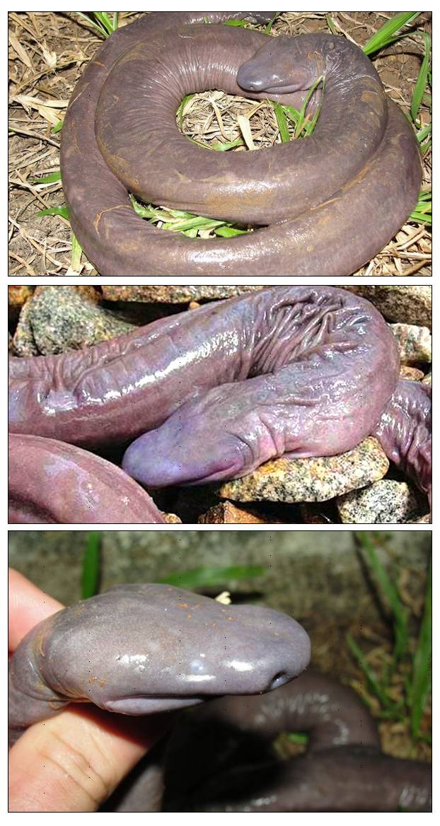 그러나 외형은 뱀 처럼 생겼지만 사실은 뱀이 아닌 것으로 알려졌다. 생물학자 줄리안 투판은 "뱀처럼 생겼지만 파충류가 아니며 오히려 도롱뇽이나 개구리 등 양서류에 가깝다"며 이 생물체를 양서류 무족목(학명 Atretochoana eiselti)이라고 밝혔다.