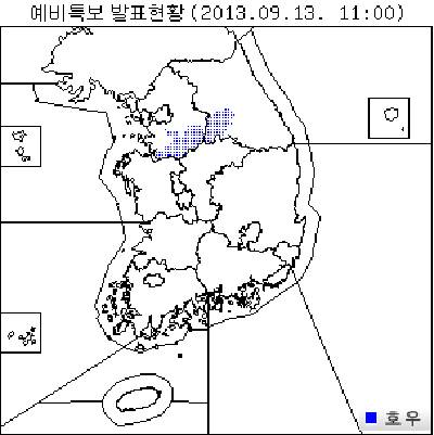 13일 기상청은 서울을 비롯한 경기도일부와 강원도영서 일부지역에 호우특보가 발효 중인 가운데, 서울과 경기도 일부지역에 천둥번개를 동반한 시간당 30mm이상, 강원북부에는 10mm 내외의 다소 강한 비가 내린다고 오후 12시 20분 발표했다.