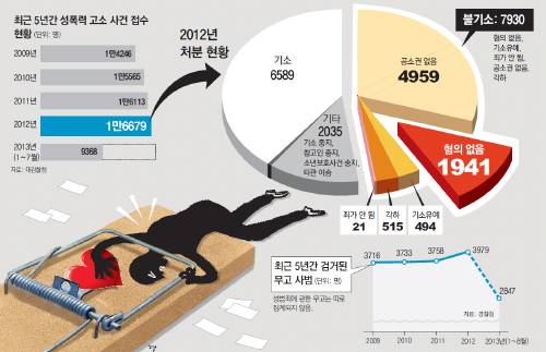 경찰청에 따르면 무고죄 사범은 2009년 3716명에서 2012년 3979명으로 매년 증가했다. 성범죄 무고는 따로 집계하지 않아 정확한 건수를 알 수는 없지만 매년 늘어나고 있다는 게 경찰과 검찰의 공통된 분석이다. 물론 남성이 저지르는 성범죄 건수가 계속 늘고 있고 수법도 흉포화하고 있는 것을 감안하면 우리 사회는 성폭력 피해를 호소하는 여성의 목소리를 더욱 귀담아듣고, 성폭행범에 대한 처벌은 강화해야 마땅하다. 하지만 그런 과정에서 발생할 수 있는 억울하게 낙인찍히는 남성은 없는지 동시에 세심한 주의를 기울여야 한다.