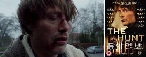 덴마크 영화 '더 헌트'에서 성추행범으로 몰린 루카스가 마을 슈퍼마켓에 갔다가 직원에게 얻어맞고 내쫓긴 뒤 절망하는 장면(왼쪽). 마을 사람들은 루카스의 집에 돌팔매질을 하고 애견까지 죽인다. 영화 포스터 속 루카스의 눈에는 삶이 무너진 남자의 원망과 절망이 섞여 있다. 영화 '더 헌트' 캡처 |