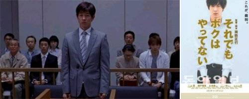 일본 영화 '그래도 내가 하지 않았어'에서 억울하게 지하철 치한으로 몰렸다가 무죄를 주장하며 1년 동안 법정 투쟁을 벌인 주인공이 결국 1심에서 유죄 판결을 받는 장면(왼쪽). "그래도 내가 하지 않았어"라는 문구와 함께 주인공이 억울한 표정을 지으며 수갑을 차고 있는 모습이 담겨 있는 영화 포스터. 영화 '그래도 내가 하지 않았어' 캡처 |