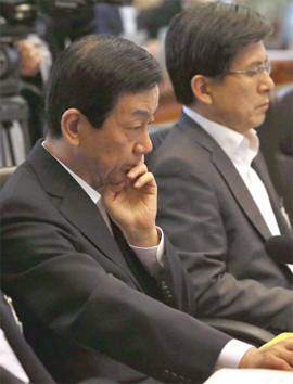 | 거취 고민중? 기초연금 공약 후퇴와 관련해 인책 사의를 검토한 것으로 알려진 진영 보건복지부 장관(왼쪽)이 26일 청와대에서 열린 국무회의에서 정부의 기초연금안에 대한 박근혜 대통령의 입장 발표를 심각한 표정으로 듣고 있다.청와대사진기자단 |