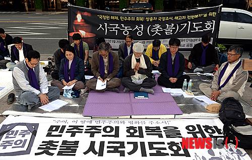 【서울=뉴시스】조성봉 기자 = 27일 오후 서울 중구 시청 서울광장에서 열린 '국정원 해체, 민주주의회복, 쌍용차국정조사, 해고자 전원복직'을 위한 시국농성촛불기도회에 참석한 기독교인들이 기도를 하고 있다. 2013.09.27.