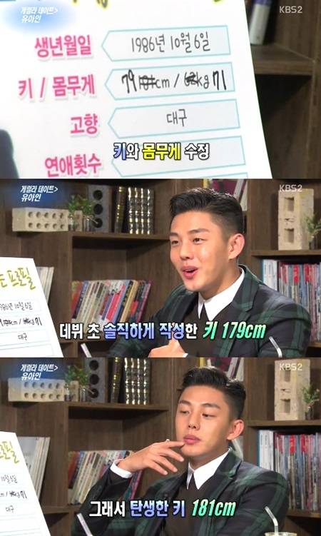 9월 28일 방송된 KBS 2TV '연예가중계'에서 게릴라데이트에 나선 유아인이 181cm로 돼 있는 프로필상 키를 수정했다.