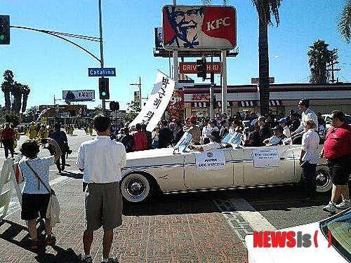28일(미서부시간) 한인타운 중심가인 올림픽 블러바드에서 펼쳐진 코리안퍼레이드에 그랜드마샬을 맡은 김무성 의원이 탄 차량에 7명의 시위대가 따라붙어 축제 관계자들이 진땀을 흘렸다.