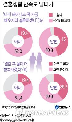 이에 따르면 '다시 태어나도 지금의 배우자와 결혼하겠나'라는 질문에 남성의 45%가 "꼭 다시 결혼하겠다"고 답했다. 이에 비해 여성은 반드시 현재 배우자를 또 선택하겠다는 비율이 19.4%에 그쳤다.