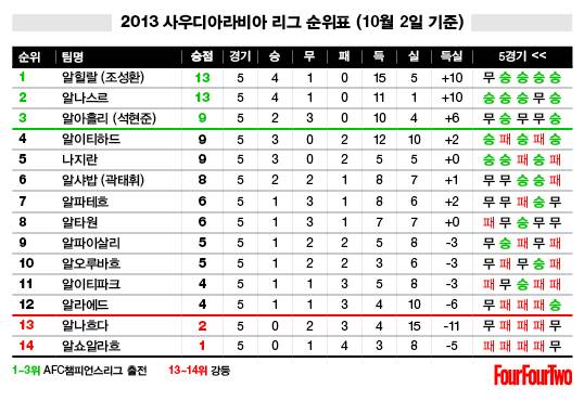 4라운드의 빅매치는 단연 알힐랄(조성환)과 알이티하드의 '사우디 엘클라시코'였습니다. 알힐랄은 높은 점유율을 기록하면서도 알이티하드에 잇달아 실점하며 1-2로 뒤졌습니다. 하지만 조성환의 리그 데뷔골을 시작으로 알힐랄은 11분간 4골을 퍼부은 끝에 5-2 대승을 거두었습니다. 알힐랄은 2009년 역사적 5-0 승리 이후 4년 만에 대승의 기쁨을 안았습니다.