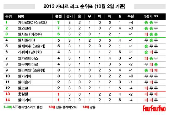 알사드를 제외한 알제이쉬, 레퀴야, 알라이얀, 알가라파 등이 시즌 초반 고전하고 있는 가운데 리그 초반의 돌풍은 신진호의 카타르SC와 알사일리야가 이끌고 있습니다.