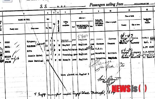 한편 이번에 발견된 고문서중엔 1933년 이 전 대통령의 뉴욕 입항 기록도 있다. 1933년 유럽 방문 후 프랑스에서 출항한 '렉스'호에 올라 뉴욕항을 통해 미국에 입국한 기록이다. 이 입국 서류에 나타탄 이승만의 직업은 '박사, 교수'(Doctor, Professor)였고, '영어를 읽고 쓸 수 있냐?"는 질문란에 '그렇다(Yes)'고 돼 있다. 인종은 '한국인'(Korean), 출생지는 '한국(Korea), 서울(Soeul)'로 작성됐다.