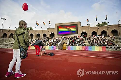 epa03899771 A crowd of people sing the Russian National Anthem, at the Stockholm Olympic Stadium in Sweden, 06 October 2013, while raising rainbow flags in solidarity with the Russian LGBT community. A project called 'Live and Let Love' will use footage from the event to be cut together with other singers and musicians from around the world to make a video film that will be shown on YouTube ahead of the Olympic games in Sochi. EPA/ERIK MARTENSSON SWEDEN OUT