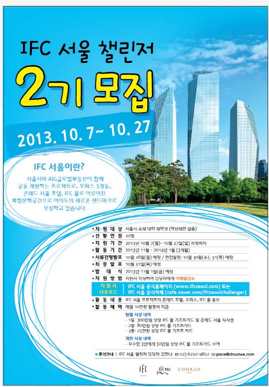IFC 서울 챌린저 2기는 서울시 소재 대학 재학생이라면 학년에 제한 없이 누구나 지원할 수 있으며, 1차 서류심사와 2차 면접을 거쳐 총 20명을 선발하게 된다. 참가를 희망하는 대학생들은 IFC 서울 공식 홈페이지(www.ifcseoul.com) 또는 IFC 서울 챌린저 공식 카페(cafe.naver.com/ifcseoulchallenger)에서 지원서를 다운받아 작성한 후 10월 27일(일) 자정까지 이메일을 통해 지원하면 된다.