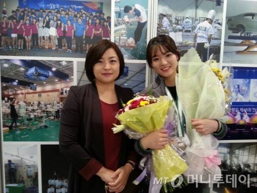 한국영상대학교 헤어디자인과 손지연 교수(왼쪽)와 이슬비씨가 전국기능경기대회 헤어디자인 부문 은상 수상 후 기념 사진을 찍고 있다. /사진제공=한국영상대 |