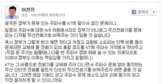 이 대표는 12일 자신의 페이스북에 "결국은 정부가 문제있는 주파수를 KT에 팔아서 생긴 문제"라며 "정부가 아날로그 무선전화기를 문제없는 디지털 무선전화기로 바꿔주는 것이 맞을 것 같다"고 주장했다.