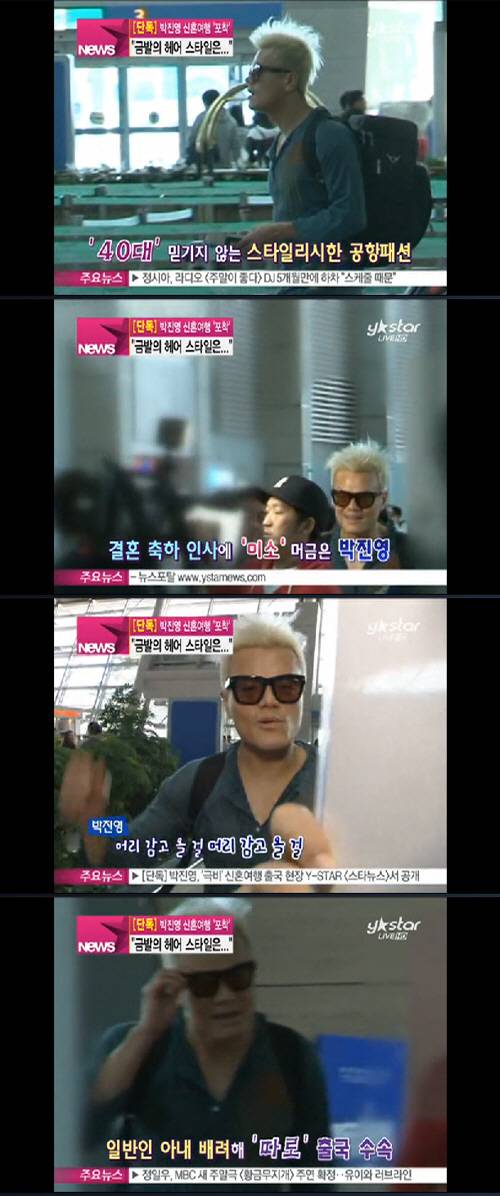 신혼여행 출발 역시 철통 보안을 자랑한 박진영은 세련된 금발 헤어에 스타일리쉬한 카키색 셔츠와 청반바지, 백 팩으로 40대라는 게 믿기지 않는 공항패션을 선보였다.