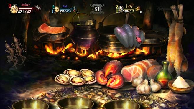 또한, 던전 클리어 이후 마을로 돌아오지 않고, 바로 다른 던전으로 들어갈 경우 중간에 간식타임(?)이 주어지며, 화면에 쌓여 있는 요리를 조리해서 먹으면 다음 스테이지를 시작할 때 공격력, 체력, 방어력 등이 향상돼 반복 플레이를 좀 더 쾌적하게 즐길 수 있게 도와준다. 음식 먹기 미니게임이라면 과거 캡콤의 천지를 먹다처럼 빨리 먹기 경쟁을 떠올릴텐데 드래곤즈 크라운의 간식타임은 음식을 만들어서 친구에게 줄 수도 있는 매우 훈훈한 시간이다.