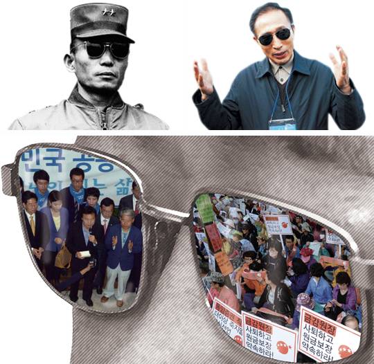 이런 와중에 선글라스를 적극 애용한 '용감한' 정치인도 있었다. 이명박 전 대통령의 경우 박 대통령과 당내 대선후보 경선을 두고 치열하게 맞붙었던 2006년 선글라스를 낀 모습으로 화제가 됐다. 이 전 대통령은 당시 "자꾸 누구(박 전 대통령) 닮았다고 이야기가 나오는데 딸이 사준 거라 어쩔 수 없이 끼는 것"이라고 말했다. 취임 이후에도 이 전 대통령의 선글라스 사랑은 이어졌다.