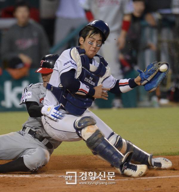 [경향포토]PO3차전, 몸을 아끼지 않는 최재훈 홈 저지