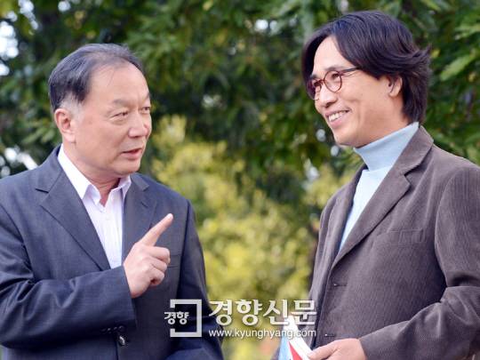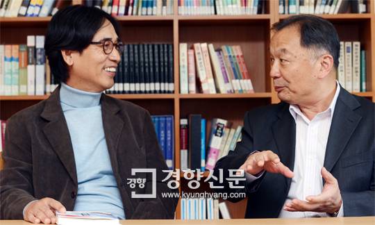 원톄쥔 교수(왼쪽)와 유시민 전 장관이 지난 18일 돌베개 출판사가 입주해 있는 경기 파주 출판단지에서 중국 혁명과 중국 공산당의 미래, 남북한 문제 등을 주제로 이야기를 나누고 있다. | 서성일 기자