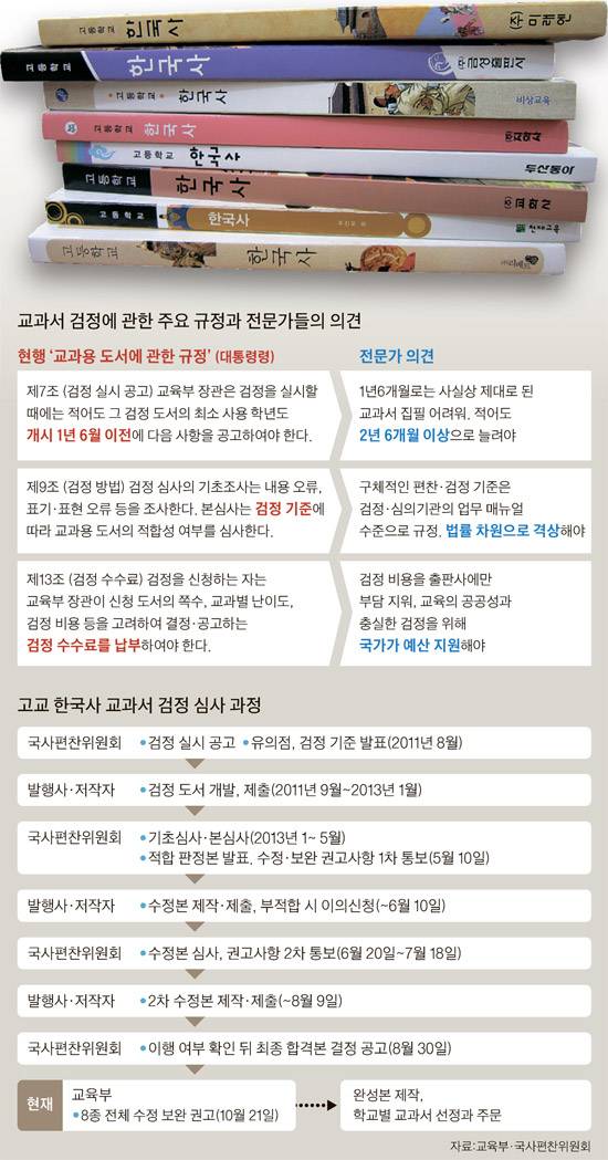 21일 교육부의 고교 한국사 교과서 8종에 대한 '수정·보완 권고'는 검정 과정에서 이미 걸러졌어야 하는 일이다. 뒤늦은 대책 마련은 검정 제도의 부실 때문이다. 현행 교과서 검정 기능은 교수·교사·전문가 등으로 구성된 검정위원회가 맡는다. 2011년 이후 역사교과서 검정은 교육부 산하 국사편찬위원회(국편) 소관이다.