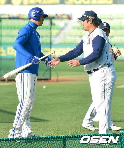[OSEN=대구, 최규한 기자] 24일 오후 대구구장에서 열리는 '2013 한국야쿠르트 세븐 프로야구' 한국시리즈 삼성 라이온즈와 두산 베어스의 1차전, 삼성 채태인과 두산 최준석이 대화를 나누고 있다.