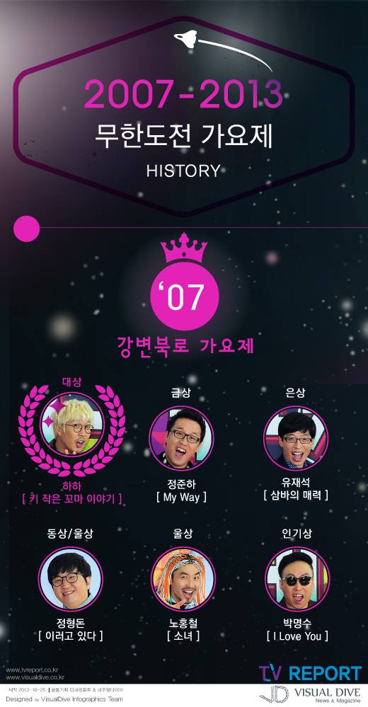 당시 '무한도전' 멤버였던 전진은 이정현과 '세뇨리따'를 불렀다. 정형돈은 에픽하이와 손잡고 '바베큐'를, 노홍철은 노브래인과'더위 먹은 갈매기'를 불렀다. 정준하는 에프터스쿨과 '영계백숙'을, 길은 YB와 '난 멋있어'를 발표했다. 히트곡 '냉면'도 이 가요제를 통해 탄생했다. 박명수는 소녀시대 제시카와 명카드라이브를 결성, 여름이면 아직도 사람들의 입에 오르내리는 '냉면'을 탄생시켰다.