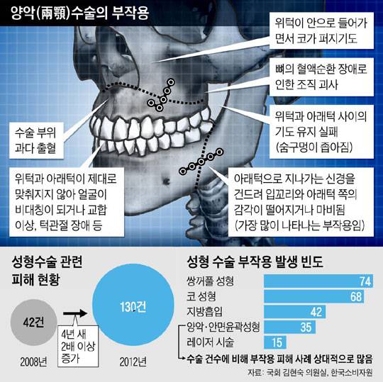 양악 수술은 얼굴 주변의 섬세한 근육이나 신경을 피해가며 드릴로 얼굴 뼈를 인위적으로 깎아내고 옮기는 고난도 수술이다. 구강 안을 수술 부위로 삼아야 하기 때문에 수술 후 이곳에서 출혈이 생길 경우 피가 기도를 막아 질식 사고가 발생할 위험성을 안고 있다. 작년 한국소비자원에 접수된 양악 수술 관련 피해 부작용 신고 건수는 35건이다. 한 해 수술 수만 건이 이뤄지는 쌍꺼풀이나 코 성형, 지방흡입에 이어 넷째로 많다.