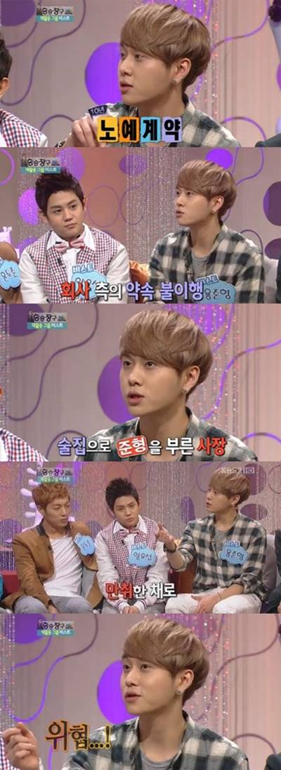 용준형은 지난해 2월 방송된 KBS2 예능프로그램 '승승장구'에서 비스트로 합류하기 전 활동했던 전 소속사에 대해 언급하며 "10년짜리 노예계약이었다"라고 밝혔다. 이어 "계약과는 달리 약속 이행이 전혀 되지 않았고 방송도 안 내보내줬다. 데뷔할 수 있는 환경도 아니어서 나가고 싶다는 뜻을 밝혔지만 대표가 술집으로 불러냈다"고 털어놨다.