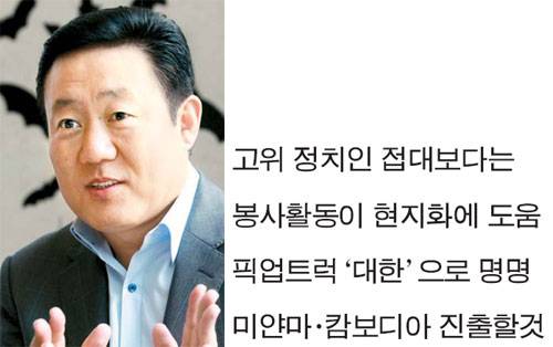 지난 4월 코라오에서 자체 개발한 픽업트럭의 모델명을 '대한(DAEHAN)'이라고 붙인 것도 한국 국가 브랜드 파워에 대한 자신감에서 비롯됐다. 그는 "대한이라는 브랜드가 한국인 입장에선 다소 촌스럽게 느껴질 수 있겠지만 라오스에선 고급스런 느낌을 준다"고 설명했다.