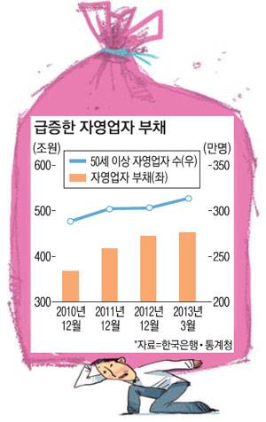 자영업자 부채 중 잠재위험부채는 60조7000억원, 고위험부채는 13조5000억원으로 추정된다. 자영업자 대출은 사업자금 용도가 많아 직장인 대출보다 절대적인 규모가 큰 데다 원리금 상환부담도 커 큰 부도 위험에 직면해 있다. 자영업자 처분가능소득 증가율은 직장인과 달리 2010년 3분기 10.5%에서 정점을 찍은 후 정체된 상황이다. 게다가 50대 이상 베이비부머 자영업자 수는 최근 월평균 3만명씩 늘고 있어 인생의 마지막 보루인 노후자금을 송두리째 날릴 수 있는 위험도 커지고 있다.