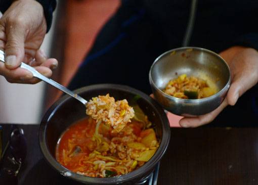 '유진식당' 위쪽으로 난 좁은 길을 몇 발짝 걸으면 15년 전통의 '고향집'이 나옵니다. 순두부찌개, 콩나물해장국, 선지해장국 한 그릇 가격이 이곳에선 '무려' 2000원입니다. 할아버지들 틈을 비집고 앉아 순두부찌개를 맛봤습니다. 맑은 국물에 순두부가 두 덩이, 그 위에 계란을 톡 깨뜨려 풀고 김 몇 조각을 찢어 올린 게 전부지만 담백하니 먹을 만합니다. 밑반찬으로 나오는 배추김치와 함께 뚝딱 한 끼를 해치웠습니다.