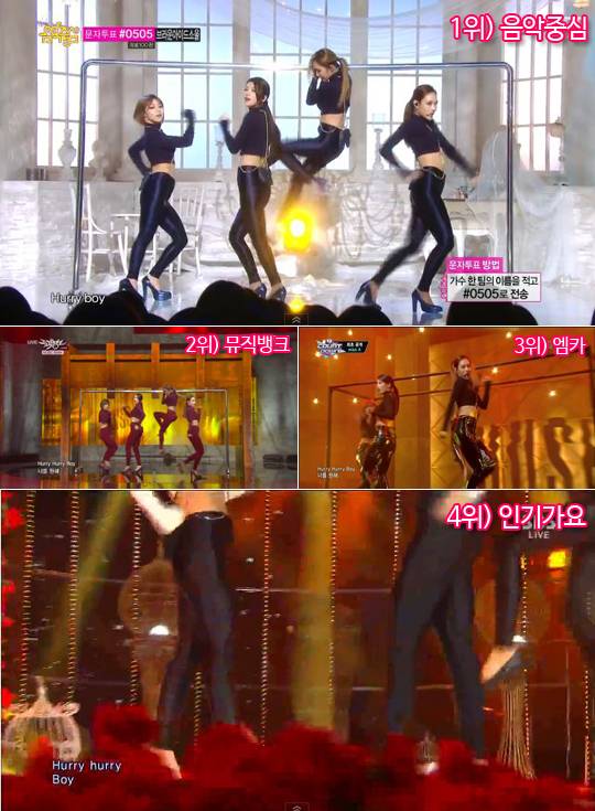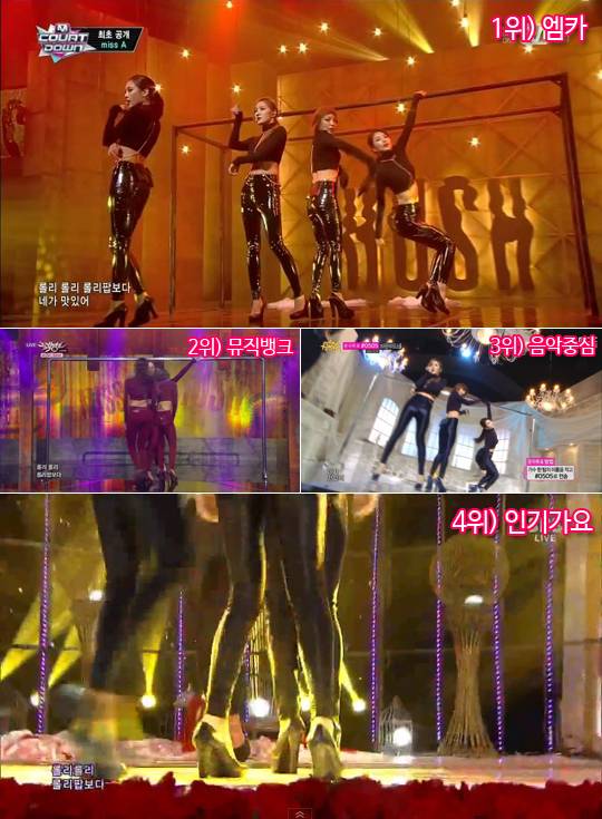 걸그룹 미쓰에이(miss A)가 약 1년여 만에 두 번째 정규앨범 '허쉬(Hush)'로 돌아왔다. 이번엔 박진영이 아니라 소녀시대의 '지(Gee)'를 만든 유명 작곡가팀 이트라이브와 함께 했다. 앨범과 동명의 타이틀곡 '허쉬'는 독특한 어쿠스틱 분위기와 후반으로 갈수록 다양해지는 전개가 인상적인 곡이다. 퍼포먼스도 한 층 더 강렬해졌다. 미쓰에이 특유의 농밀한 분위기와 함께 봉을 활용한 퍼포먼스가 인상적이다. 고난도의 파워풀한 춤은 없지만 절제된 듯 아른거리는 동작들이 섹시함을 준다. '아슬아슬하게 아찔하게' 섹시함을 절제하는 미쓰에이의 모습이 고품격 섹시함을 선사한다. 미쓰에이의 섹시함을 담아내야 하는 음악방송 카메라워크도 적절한 절제가 필요하다. 요리조리 앵글을 바꾸는 현란함보다는 흐느적거리는 느긋한 카메라워크가 관건이다. 과연 어떤 음악방송이 미쓰에이의 무대를 가장 진하게 담아냈을까?