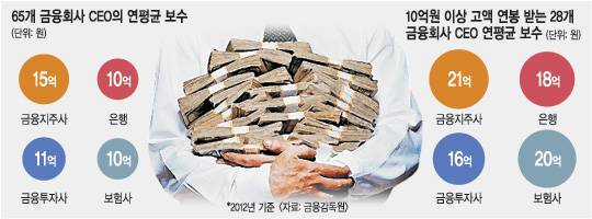 지난해 금융업종별 CEO의 평균 연봉은 금융지주사 15억원, 은행 10억원, 금융투자사 11억원, 보험사 10억원이었다. 이는 일반 금융사 직원 연봉의 평균 20∼26배에 달하는 액수다.