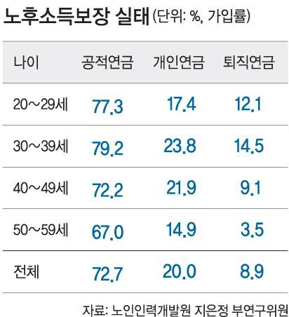 결국 공적연금만으로는 노후 준비가 턱없이 부족할 수밖에 없지만 퇴직연금, 개인연금 등 민간 연금제도도 이제 막 태동하는 단계여서 노후 준비에 필요한 '삼박자'가 모두 부실하다.