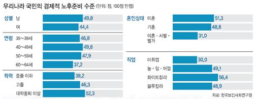 한국보건사회연구원이 지난해 보건복지부가 개발한 노후준비 지표에 따라 35∼64세 남녀 3070명의 재무준비 상태를 조사한 결과 응답자의 평균 점수는 100점 만점에 47점으로 나타났다. 건강영역이 75.0점, 대인관계 60.5점 보다 크게 낮은 수준이다.