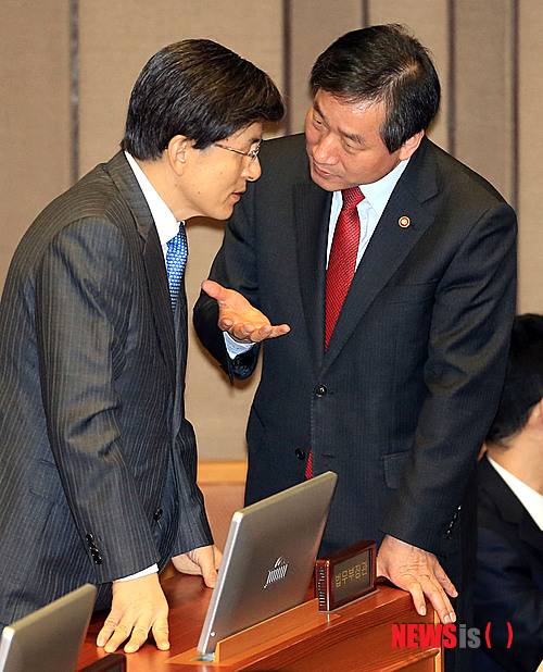 【서울=뉴시스】박동욱 기자 = 유정복 안전행정부 장관과 황교안 법무부 장관이 18일 오전 서울 여의도 국회에서 열린 본회의에서 대화를 나누고 있다. 2013.11.18.