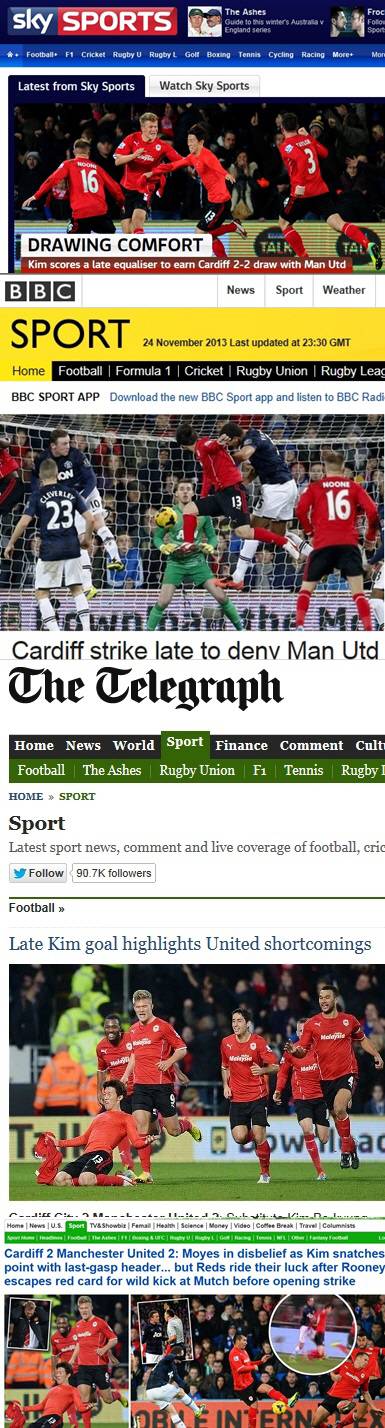 승리를 다 잡았던 데이비드 모예스 맨유 감독이 김보경의 일격에 머리를 감싸쥐었다. 패배를 예감했던 카디프시티 홈팬들은 '김(Kim)의 활약'에 난리가 났다. 카디프시티 스타디움을 가득 메운 4만여 명의 관중들은 경기종료 후에도 자리를 뜨지 않고 응원가를 부르며 기쁨을 만끽했다.