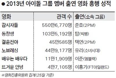 아이돌 바람은 지난해부터 거셌다. '건축학개론'과 '26년'(2AM의 슬옹) '자칼이 온다'(JYJ의 영웅재중) '돈 크라이 마미'(유키스의 동호) '회사원'(제국의 아이들의 동준) 등이 극장에 걸렸다. 올해도 여전하다. 올 가을만 해도 '동창생'과 '배우는 배우다'(엠블랙의 이준) '결혼 전야'(2PM의 옥택연) '노브레싱'(소녀시대의 유리)이 흥행 전선에 뛰어들었다. 올 겨울 최고 기대작 중 하나인 '변호인'에는 시완(제국의 아이들)이 얼굴을 비춘다. 내년 개봉 예정으로 봉준호 감독이 제작하는 '해무'에선 JYJ의 유천이 엔딩 크레딧의 윗자리를 차지한다.